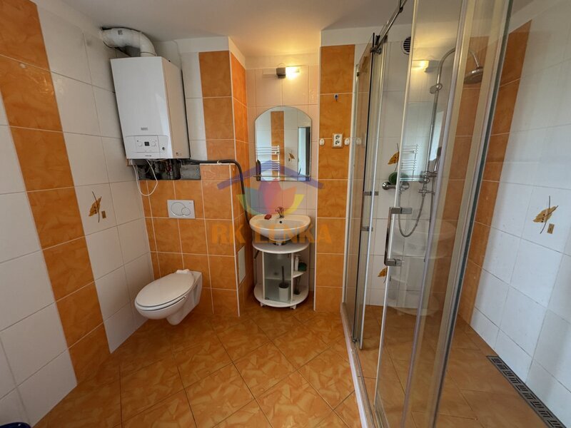 Koupelna je vybavena prostorným sprchovým koutem. Vytápění je řešeno